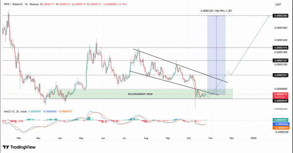- Pepe Coin’s price has stabilized near a key historical demand zone, signaling potential for accumulation.