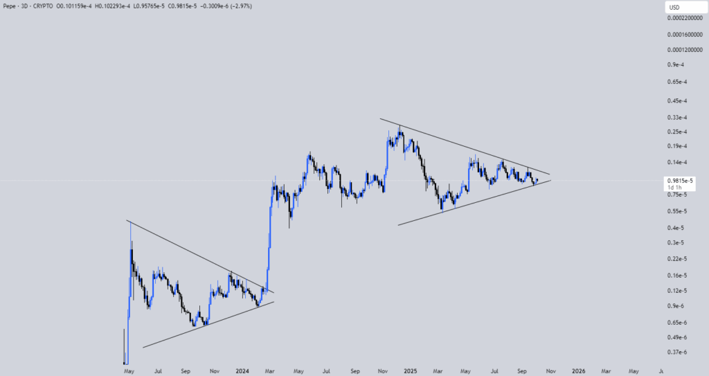 Crypto market analyst Jameson (@jamesonxbt) recently shared a detailed outlook on PEPE, emphasizing a long-term symmetrical triangle formation. The structure mirrors a previous setup that preceded PEPE’s strong breakout in late 2023. According to the analyst, there is “no second best meme coin,” and a $20B+ market capitalization for PEPE appears inevitable once Bitcoin dominance declines and ETH/BTC rallies.