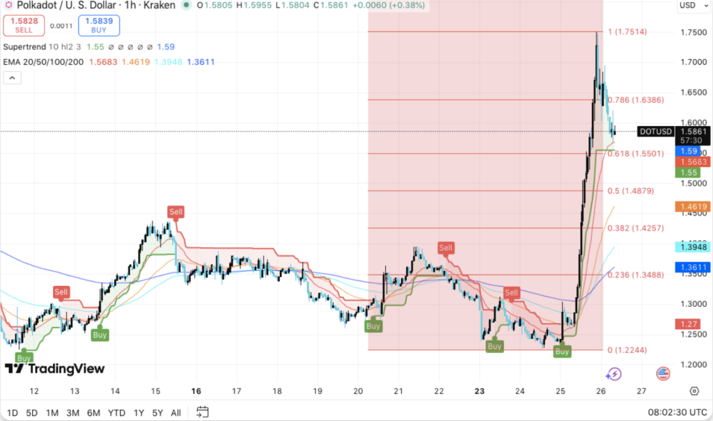 However, price remains sensitive around $1.55, which aligns with the 0.618 Fibonacci retracement. Hence, holding this level supports the current bullish structure. A decisive push above $1.75 could open the path toward $1.80 and $1.90.