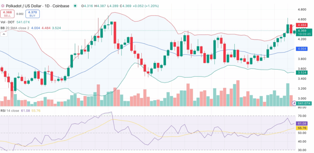 At the time of reporting, DOT was trading at $4.37, reflecting a 0.7% dip on the day but marking an 8% gain over the past seven days. Over the past month, the asset has appreciated 11%. Despite the recent uptrend, DOT remains significantly below its all-time high of 2021, showing a 92% decline from that peak.