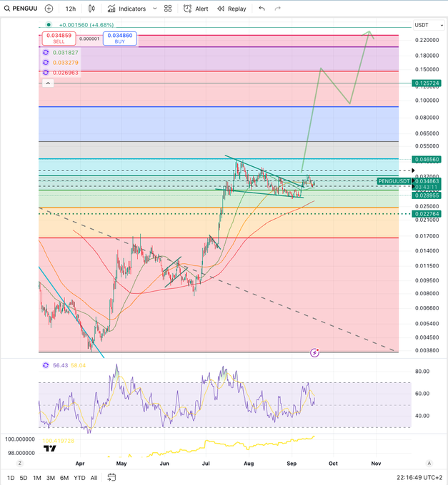 The 12-hour chart shows $PENGU retracing into a contracting range after its sharp summer rally. This range developed into sideways movement between $0.028 and $0.035, suggesting accumulation rather than selling. Momentum indicators are leaning constructive, reinforcing the idea of ongoing demand.