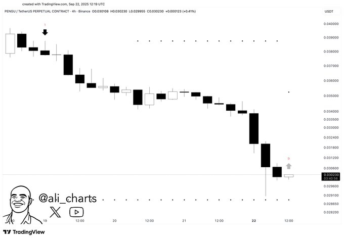 - PENGU shows a TD Sequential buy signal after nine consecutive bearish candles.