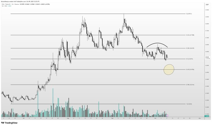 The visual analysis shared by Altcoin Sherpa underscores the fading participation evident in declining volume trends. Earlier rallies were supported by strong inflows, yet recent sessions show thinning liquidity and weakening conviction. The gradual rounding formation across recent highs suggests a distribution phase typical of profit-taking cycles after extended bullish runs.