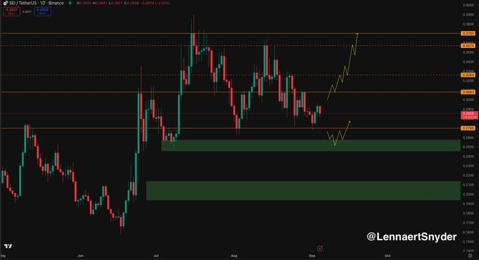 According to chart analysis shared by Lennaert Snyder, SEI bounced from the $0.27 support, a level tested several times. Holding this zone indicates that buyers are still absorbing sell pressure and maintaining control over short-term direction.
