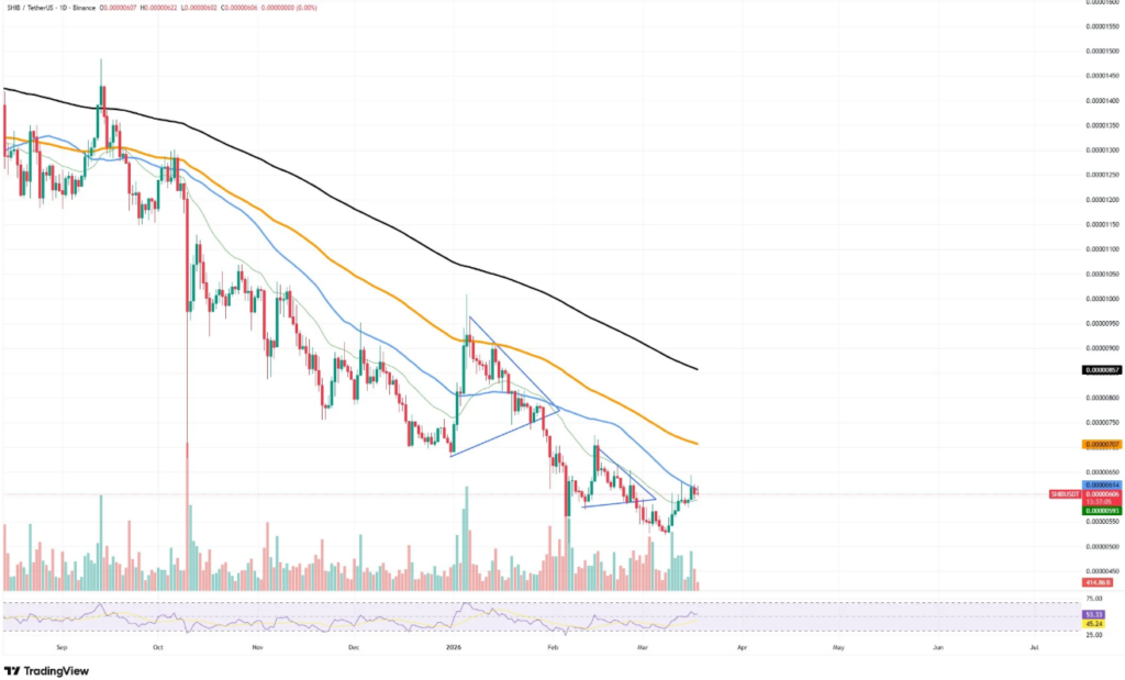 Despite this development, Shiba Inu remains within a broader downtrend marked by consistent lower highs and lower lows. Moreover, key technical indicators continue to reflect weakness, with the price trading below major moving averages. These levels, including the 50-day and 100-day exponential moving averages, still act as dynamic resistance zones.