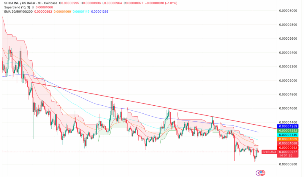 On the daily chart, Shiba Inu stays below all major exponential moving averages. The 20-day and 50-day EMAs sit near $0.00001068 and $0.00001069, while the 100-day and 200-day levels hold at $0.00001149 and $0.00001259, respectively. This tight cluster of resistance reinforces a bearish setup. The Supertrend indicator also remains negative, confirming that downward pressure has not eased.