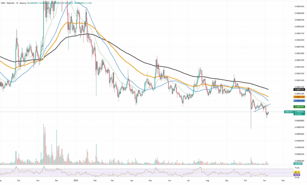 From a technical standpoint, the token remains below the 50-day, 100-day, and 200-day exponential moving averages, suggesting that SHIB continues in a bearish cycle. The Relative Strength Index hovers near 40, signaling potential exhaustion among sellers. Despite a slight rebound, the asset has yet to surpass any significant resistance level, with $0.0000105 marking the first major test for buyers.