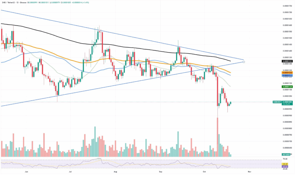 Shiba Inu is showing early signs of stabilization after enduring one of the year’s toughest corrections. Following a market-wide selloff that caused the meme token to add another zero to its price, SHIB is now consolidating around $0.0000098. The current movement suggests that selling pressure has eased, allowing the token to establish a potential base for recovery.