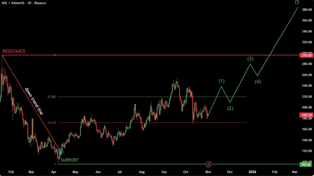 Technical analyst NekoZ observes an Elliott Wave pattern that aligns with a multi-stage bullish cycle. After reaching a base near $95 to $100, Solana appears to have completed its initial impulsive wave and corrective phase. The analyst expects the next advance, known as Wave 3, to extend toward $295, a level aligned with Fibonacci retracement metrics. If momentum persists, the projected Wave 5 could lift prices toward $380, signaling renewed investor participation. Maintaining levels above $180 remains essential for preserving this bullish outlook.