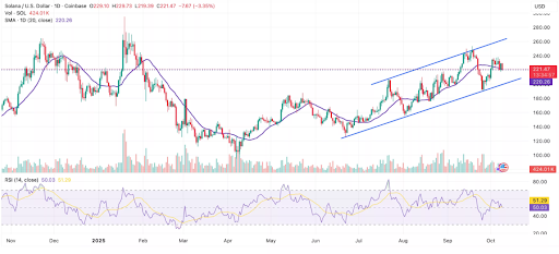 Following the rebound, the Solana price recovered to around $222 and currently trades above the 20-day simple moving average, signaling continued medium-term support. The token remains within its established ascending channel on the daily chart, reflecting a constructive setup despite short-term volatility. Although the latest rally failed to surpass the recent peak near $237, analysts observe steady accumulation, indicating a controlled consolidation phase rather than a trend reversal.