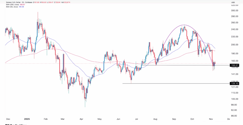 Solana’s price has entered a bear market after sliding more than 35% from its September high. The token is currently trading near $160, marking its weakest level since August. Despite substantial inflows into Solana-linked exchange-traded funds, its value remains under pressure due to broader market weakness.