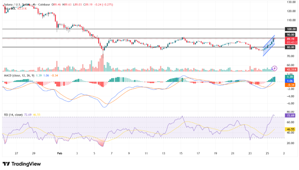 - Technical indicators show strong bullish momentum for Solana, with RSI near 73 and resistance levels lining up at $90, $95, and $100.