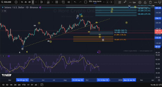 Analyst @Morecryptoonl noted that the ongoing correction marks a wave B structure in tandem with Fibonacci retracement levels between $138 and $117. This zone has been highlighted as the main support zone, which is the area where long-term buyers generally begin reaccumulating. Historically, Solana’s deep retracements within similar ranges have triggered renewed bullish participation after brief consolidation periods.
