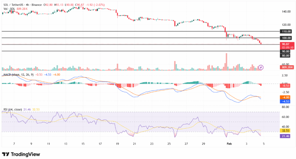 - Solana has declined over 26% in a week and slipped below the $90 mark under strong bearish momentum and broader market pressure.