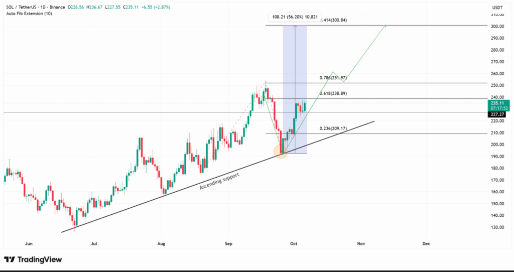 - Solana rose 3.57% to $236.46, holding firm above its ascending support line, reflecting renewed investor confidence and market strength.