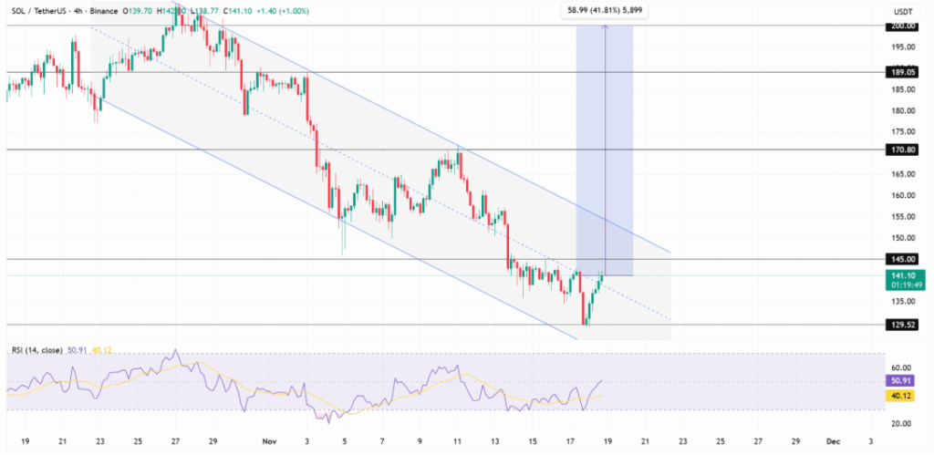Solana’s price is currently testing the upper boundary of a falling channel following a recovery from the $129 level. This zone has shaped recent trading behavior, with price action now approaching the mid-line of the channel, a key structural point often associated with directional shifts. The $145 and $170.80 zones remain significant as historical reaction levels.