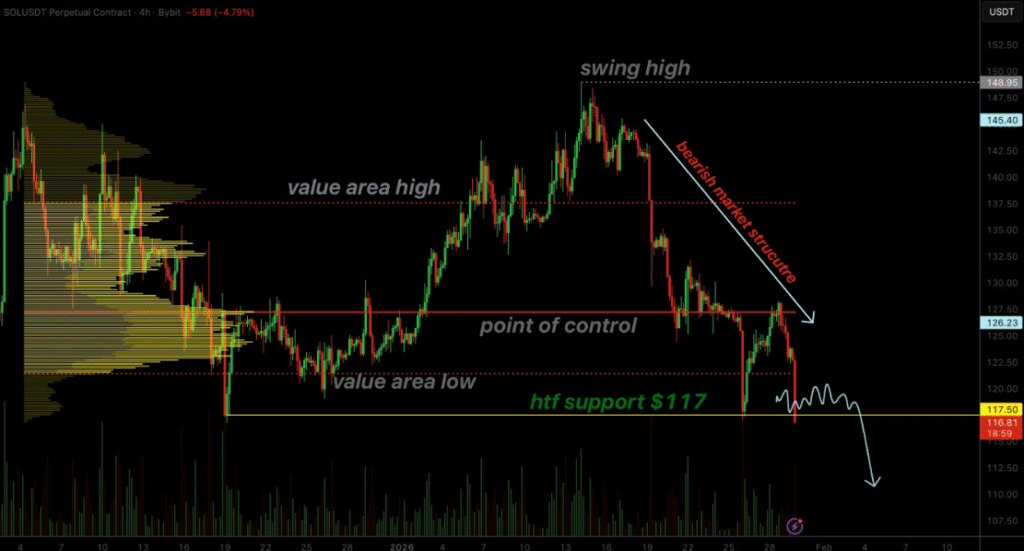 The prevailing market structure for Solana is clearly bearish, with each rally resulting in lower highs, signaling continued control by sellers. Recently, Solana has returned to the critical $117 support zone, a high-time-frame level that has now been tested multiple times. Despite the attempts to stabilize here, these tests have failed to generate any meaningful buying pressure, suggesting that the level might not be as strong as previously thought.