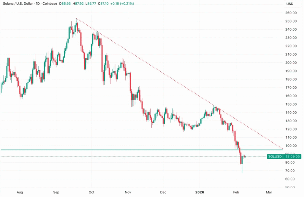 Solana (SOL) is trading near $87.10, following a 20% recovery from the $72 crash low, which marked the token’s lowest point since early 2024. The recent rebound comes amidst a shift in market flows, as positive spot inflows contrast with continued outflows from Solana-focused ETFs. Despite the bounce, institutional investors appear hesitant to commit fully, reflecting ongoing uncertainty around the token’s price trajectory.