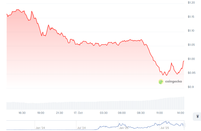 Data liquidation highlights market stress. In 24 hours total liquidations were over $578,000, of which was $436,000. This implies giving up by over-leveraged traders as prices plunged down. Still, consistent accumulation near the $1.00 level shows efforts to stabilize the market as liquidity consolidates after rapid deleveraging.