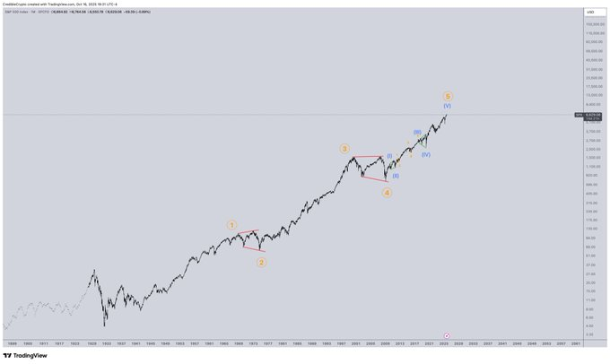 The Elliott Wave framework mapped on the S&P 500 chart shared by analysts CredibleCrypto. Outlines a five-wave impulsive sequence beginning after the Great Depression, each phase reflecting a collective rhythm of optimism and contraction. The first recovery was Wave (1) and then there was corrective Wave (2) in the middle of the 20th century challenges of the cyclical.