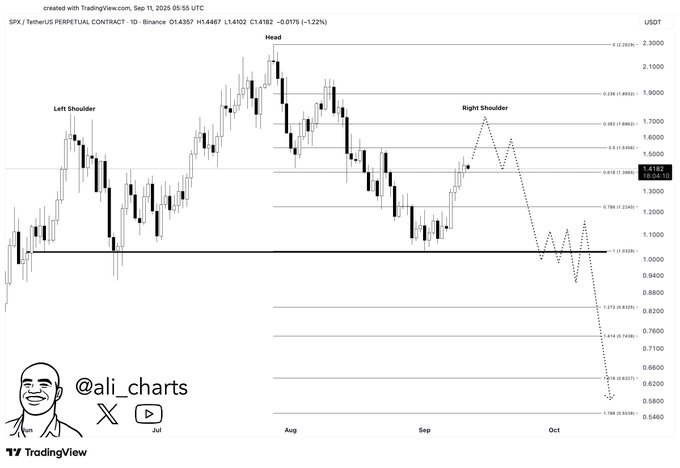 Analyst Ali (@ali_charts) shared that SPX6900 appears to be shaping a head-and-shoulders pattern, with the left shoulder forming in late June, a head in late July, and the current price action creating the right shoulder.
