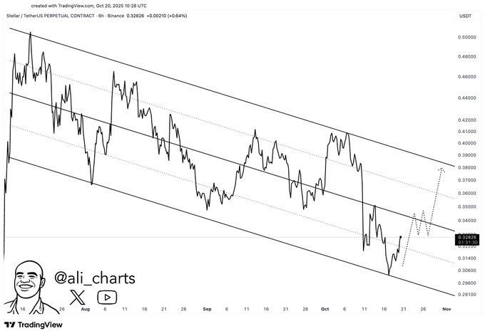 The chart shared by analyst Ali (@ali_charts) offers a technical overview of Stellar’s ongoing structure, identifying a rebound phase after a prolonged downward move. The visual shows XLM trading between two parallel declining trendlines — a hallmark of a disciplined bearish trend that has guided price behavior since mid-July. Within this formation, the asset has maintained a steady rhythm of lower highs and lower lows, creating a predictable trading range.
