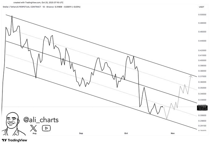 Analyst Ali (@ali_charts) has drawn attention to Stellar’s descending channel formation, suggesting a potential bullish reversal setup within its ongoing corrective pattern. His analysis emphasizes a strategic entry near the $0.30 level, aligning with the lower boundary of the channel where previous reactions have sparked temporary recoveries. The structure displays an organized pattern of lower highs and lower lows, maintaining technical discipline while allowing for controlled rebounds.
