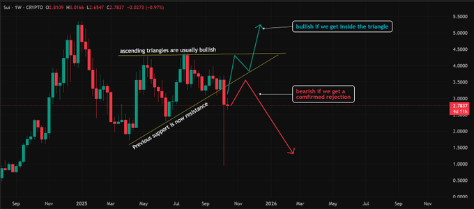 If Sui successfully closes back inside the formation, upside targets between $3.80 and $5.00 come into play. Conversely, rejection at resistance could confirm sustained bearish sentiment, opening the path toward $2.00 or lower support zones. The setup remains binary — reclaim or reject — defining the next decisive phase for price direction.