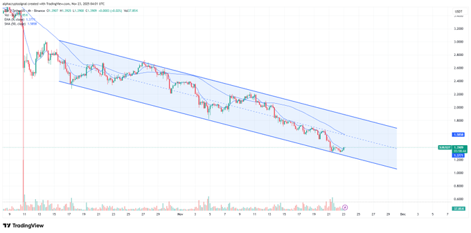 A cluster of small-bodied candles near the lower trendline indicates slowing downside momentum. The reaction resembles conditions described in a post from Alpha Crypto Signal, which noted that liquidity thins near these boundaries as sellers take profit. These shifts often offer space for short-lived corrective movement within a dominant bearish structure.