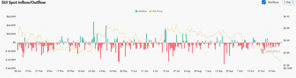 From August forward, netflows shifted again as outflows became more consistent. Price declined through the $3 area toward $2 while deeper red spikes emerged in September and October. Market fatigue became evident entering November as SUI fell near $0.74 without major flow surges, signaling quieter activity rather than strong directional pressure.