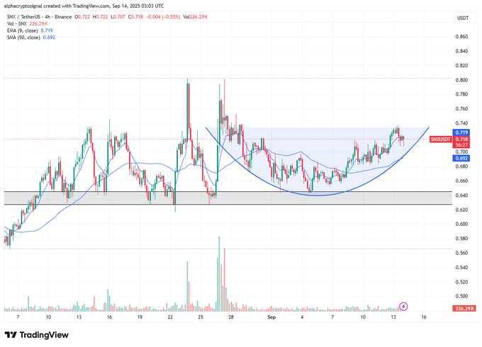 - Synthetix (SNX) forms a rounding bottom pattern with neckline resistance around $0.73 on the 4H timeframe.