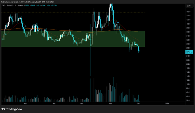 The chart shows TAO breaking decisively beneath a broad consolidation band where price spent several months. That range once acted as firm support, yet repeated retests throughout late November produced weaker reactions. Each candle near the lower boundary formed smaller bodies, pointing to little interest from buyers.