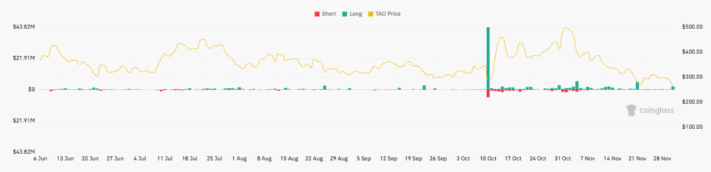 As TAO declined through November, long-liquidation spikes returned with each drop below $350 and $330. Open interest and volume concentration on Binance, MEXC, and Bitget demonstrate where most positions sat before unwinding. With TAO down 4.22% daily and 11.26% weekly, leveraged traders remain pressured in a weakening structure.