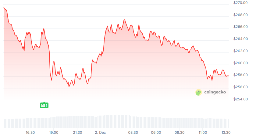 TAO trades near $258.12 as ongoing weakness drives price toward fresh lows. Selling pressure accelerates while prior consolidation zones convert into resistance, leaving the market with thinning support.