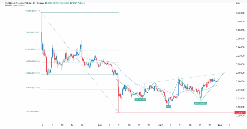 Despite the bearish pressure from whales and the stablecoin growth slowdown, WLFI’s price chart shows signs of a potential bullish reversal. On the 8-hour chart, an inverse head-and-shoulders pattern has formed, a commonly recognized technical indicator of a price reversal. Furthermore, WLFI has moved above its 50-period Exponential Moving Average, signaling that a price rally could be on the horizon.