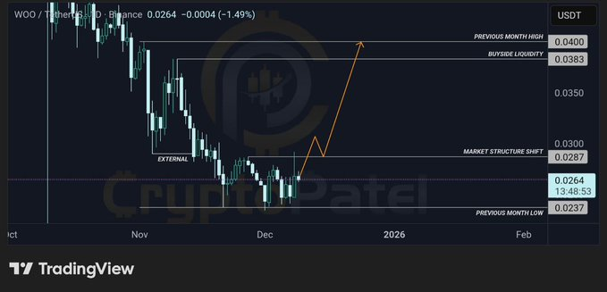 - WOO shows a structural change after a monthly low sweep and reclaimed levels on charts.
