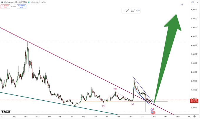 Analyst Crypto MAC (@Cryptomacreal) projects a bullish scenario for Worldcoin, suggesting that the asset could surge toward $15 if a breakout is confirmed. His chart analysis identifies a completed corrective wave cycle within a descending triangle that has defined WLD’s market behavior since late 2023. The structure, marked by phases (A), (B), and (C), indicates that selling pressure may have reached exhaustion.