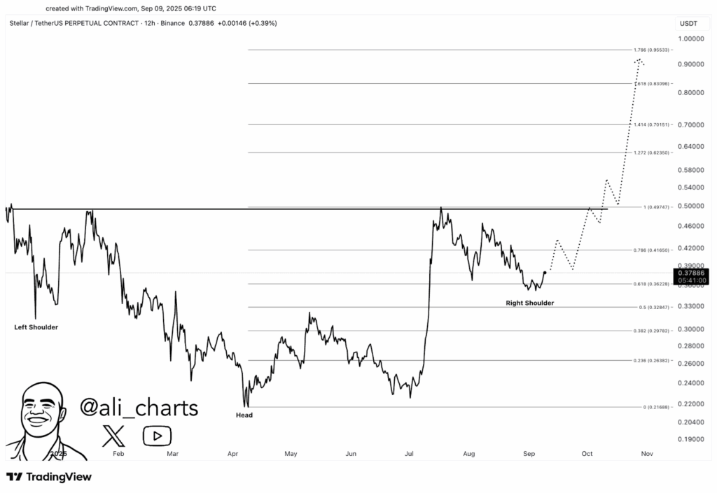 The neckline is near $0.50. If XLM breaks this level with strong volume, it could open the door for a rally toward $0.70, $0.83, and even $0.95.
