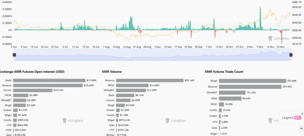 • Stable spot volume and consistent market engagement support XMR’s recovery near the $410 price zone.