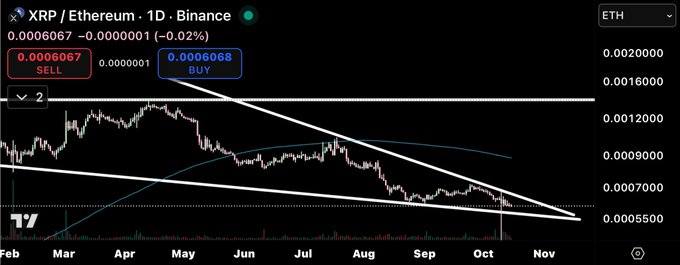 Since April, XRP’s ratio against ETH has compressed within the wedge, with both upper resistance and lower support nearing convergence. Historically, such compression phases resolve sharply, often leading to swift recoveries for the lagging asset. The tweet suggests XRP could outperform Ethereum once this structure resolves, a view consistent with classical chart interpretations.