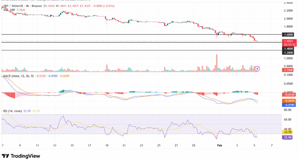 XRP price continued its downward spiral on Thursday, trading around $1.43 after a sharp 10% daily loss. This decline dragged the cryptocurrency to its lowest point since November 2024. Over the past week, XRP has dropped by 20%, with losses expanding to nearly 40% for the month.