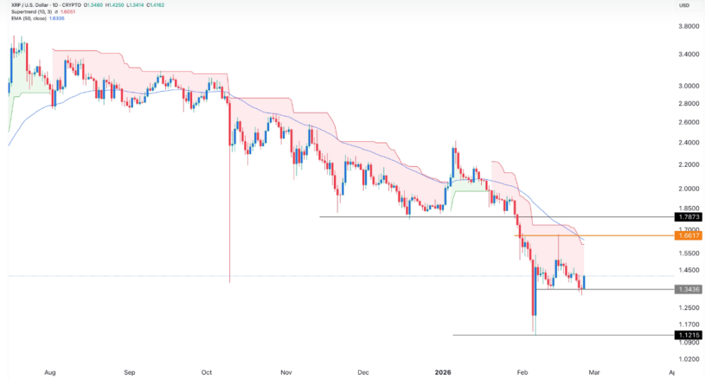 • Futures open interest climbed to $2.3 billion while technical charts show a double-bottom pattern forming near $1.34 support.