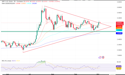 The Relative Strength Index (RSI) is hovering around 56, reflecting moderate bullish momentum. After bouncing from oversold territory in late September, XRP appears to be consolidating within a compressed range. Traders are patiently awaiting a decisive breakout.