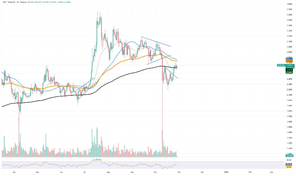 Following a brief recovery from October’s sell-off, XRP tried to climb toward the $2.75 to $2.80 range. However, the asset faced strong rejection at that level, triggering a renewed wave of selling. This pullback reflects traders’ growing expectation of a continuing downward move, especially as the price remains below major moving averages. The inability to close above the 200-day and 50-day EMAs highlights the weakening structure of the current trend.