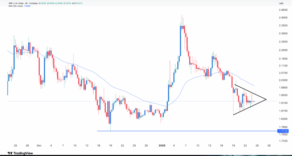 Looking at the technical side, XRP’s price chart shows the formation of a bearish pennant pattern. This pattern, characterized by a symmetrical triangle and a vertical line, suggests that further downside is likely in the near future. XRP has struggled to stay above both the 50-period moving average and the 50-period exponential moving average, reinforcing the bearish outlook. A breakdown from this pennant pattern could lead to a drop towards the next key support level at $1.77, approximately 7.65% lower than the current price.