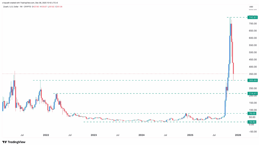 Zcash (ZEC) is currently experiencing a significant price drop, down 12.41% as of December 6, 2025. The privacy token, which traded at $352 today, has fallen by 53% from its highest point this year, reaching its lowest level since December 31. Its market capitalization has plunged from over $11 billion to $5.8 billion. This price action aligns with the predictions made by the Wyckoff Theory, which charts the natural phases of market cycles.