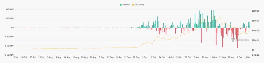 Exchange netflows reveal a broader pattern that shaped recent volatility. Strong outflows appeared in early October as traders moved assets away from exchanges. That period aligned with ZEC’s sharp climb through late September and early October.