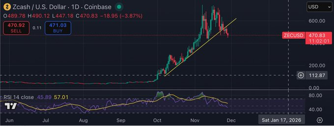 A tweet from JonnyJpegs advises traders to avoid timing an exact bottom during this phase. He notes that ZEC reached a high near $600 before slipping toward $470, signaling a broad loss of upward pressure. His caution supports the current structure, which shows a break below the steep November trendline that guided the earlier advance.